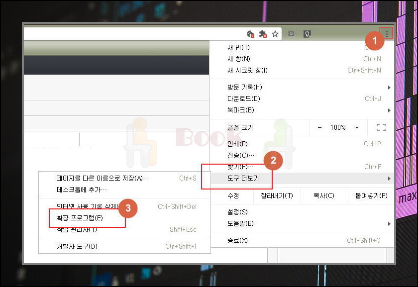 1. 우선 설정 작업을 진행해야 합니다. 크롬을 실행한 후 오른쪽 위에 있는 설정 탭을 눌러주세요. 설정 탭에서 '도구 더보기'를 클릭하여 확장 프로그램을 실행해야 합니다.