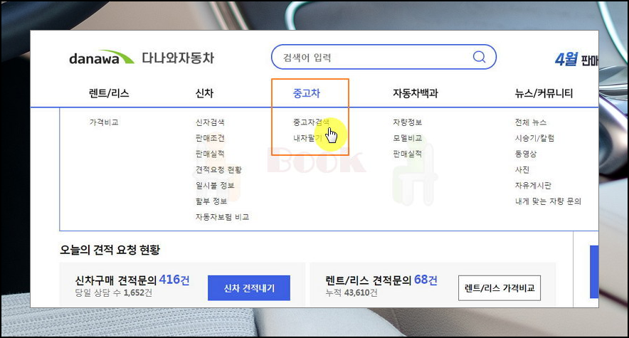 새롭게 열린 다나와 자동차 사이트에서는 신차, 렌트카, 리스 차량에 대한 정보도 얻을 수 있어요. 이번 시간에는 기아 중고차 시세 표가격을 알아보려고 하는데요. 메뉴에서 [중고차 검색]을 클릭하면 쉽게 알아볼 수 있어요.
