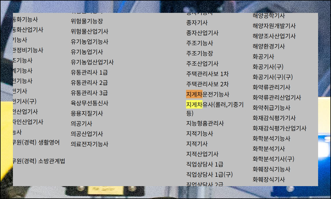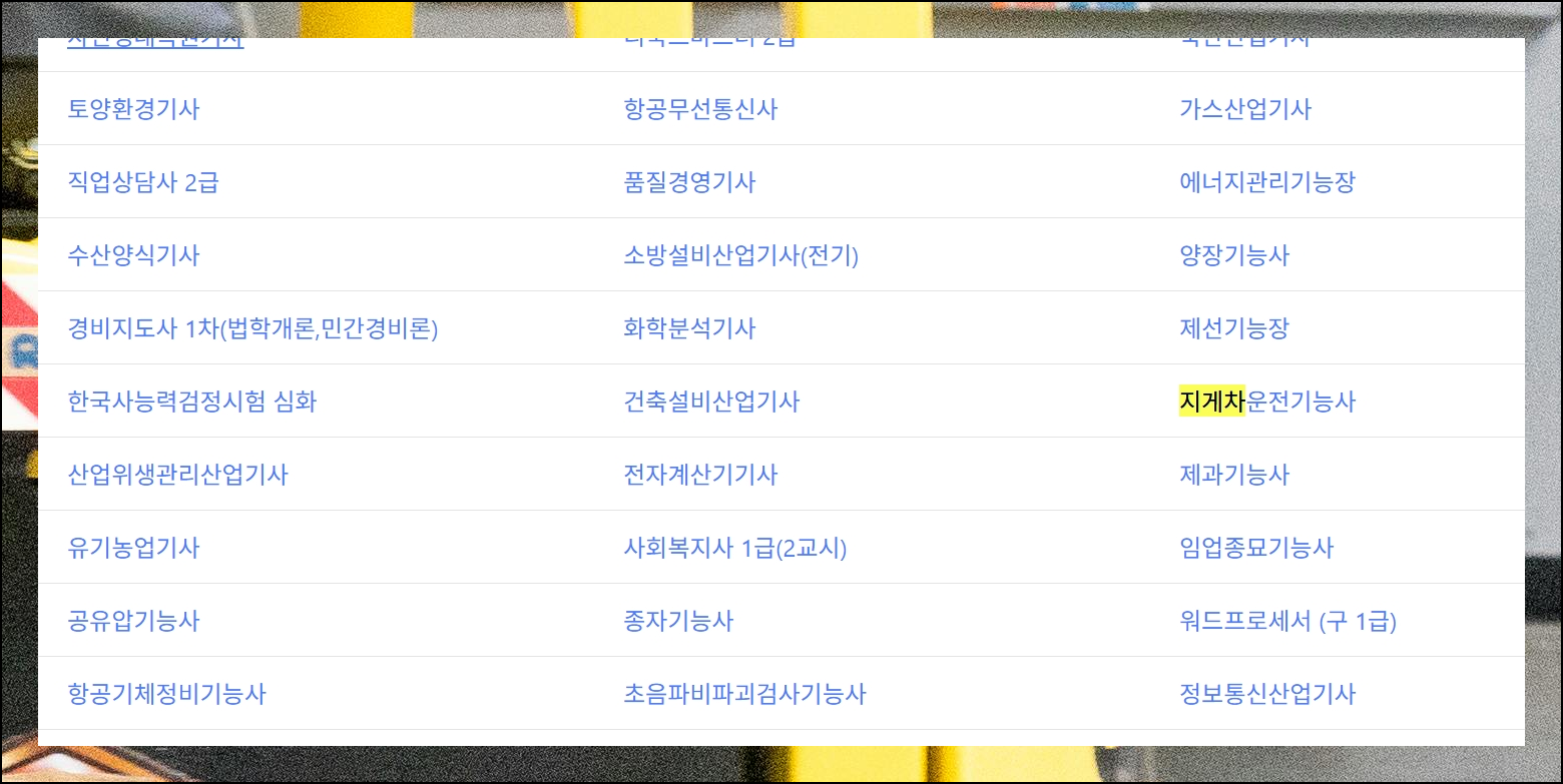 항공기관정비부터 웹디자인까지 폭넓은 자격증 기출문제가 마련되어 있습니다. 지게차운전기능사 관련 항목을 선택해서 들어가시면 되어요. 필기 대비에 필요한 모든 것들이 체계적으로 정리되어 있습니다.