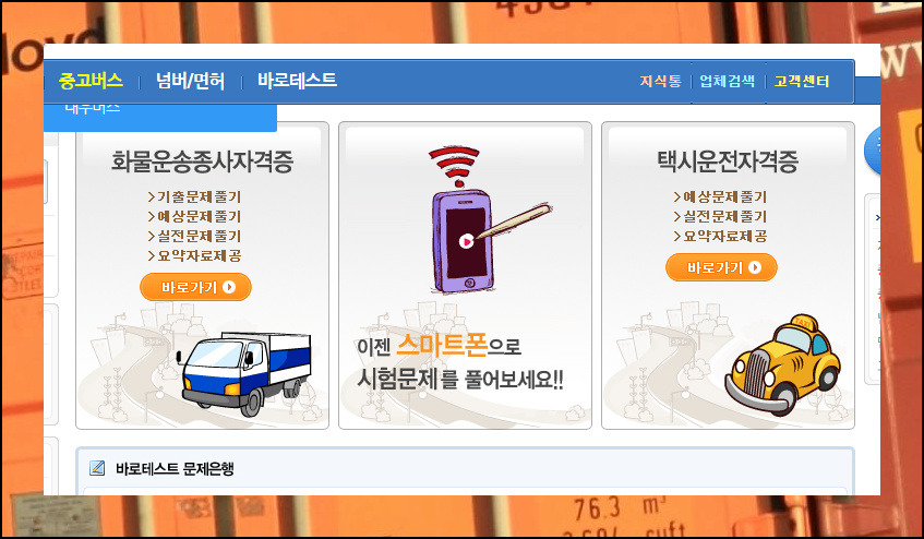 웹사이트 구조를 살펴보면 운전기사 채용공고, 중고트럭 매물 등의 메뉴가 체계적으로 배치되어 있습니다. 메인 화면에서도 화물운송업체 구인광고를 손쉽게 찾아볼 수 있어요. 우리가 목표로 하는 기출문제 자료는 상단 메뉴 중 가장 우측에 배치된 바로테스트 항목을 선택하면 접근할 수 있습니다.