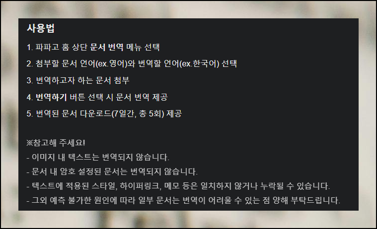 더욱 효율적인 번역기 활용을 위한 팁들을 알려드릴게요. 이미지 속 텍스트는 인식되지 않으니 직접 입력해야 합니다. 암호가 설정된 문서라면 비밀번호를 미리 해제하고, 작업을 시작하세요.