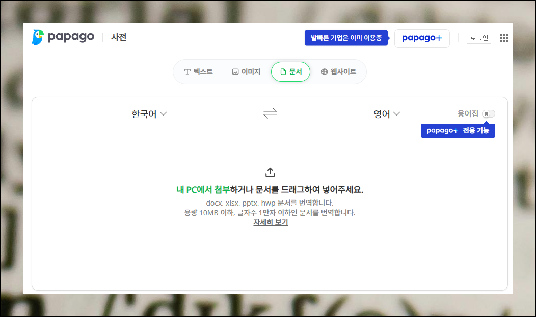 두꺼운 영어 자료 때문에 스트레스받을 필요가 없습니다. 파일을 화면 중앙으로 끌어다 놓으면 자동으로 작업이 시작되거든요. docx, xlsx, hwp, pptx 파일들을 모두 처리할 수 있어요. 파일 크기는 10mb 미만, 텍스트는 1만자 이하로 제한됩니다.