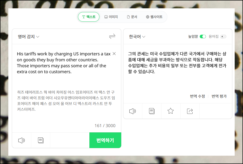 번역이 필요한 순간에는 복잡한 과정을 거치지 않아도 되니까요. 왼쪽 입력창에 영어 문장을 넣고 버튼만 누르세요. 변환 결과는 물론이고 한글 발음까지 함께 나오니 학습에도 유용합니다. 해외 번역기에서는 찾기 어려운 세심한 배려죠.