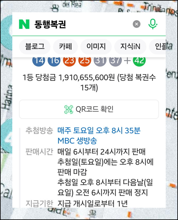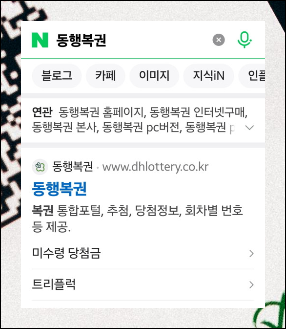 스마트폰의 웹 브라우저를 실행한 다음 네이버 홈페이지로 이동하세요. 메인 화면 상단의 검색 입력란에 동행복권을 타이핑하고 검색 실행 버튼을 눌러보세요. 검색 결과 페이지에서 아래쪽으로 스크롤을 내리면 "큐알코드 확인"이라는 메뉴를 발견할 수 있습니다.