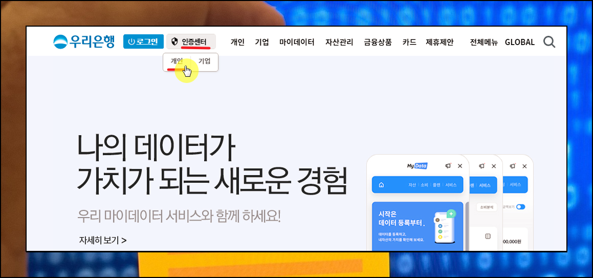 은행이나 증권사 등 공인인증서를 발급해 준 사이트에 접속하면 [인증센터] 메뉴가 있습니다. 해당 메뉴를 선택한 후 [개인]을 눌러주세요. 회사용으로 발급을 받은 경우에는 [기업]을 선택하면 됩니다.