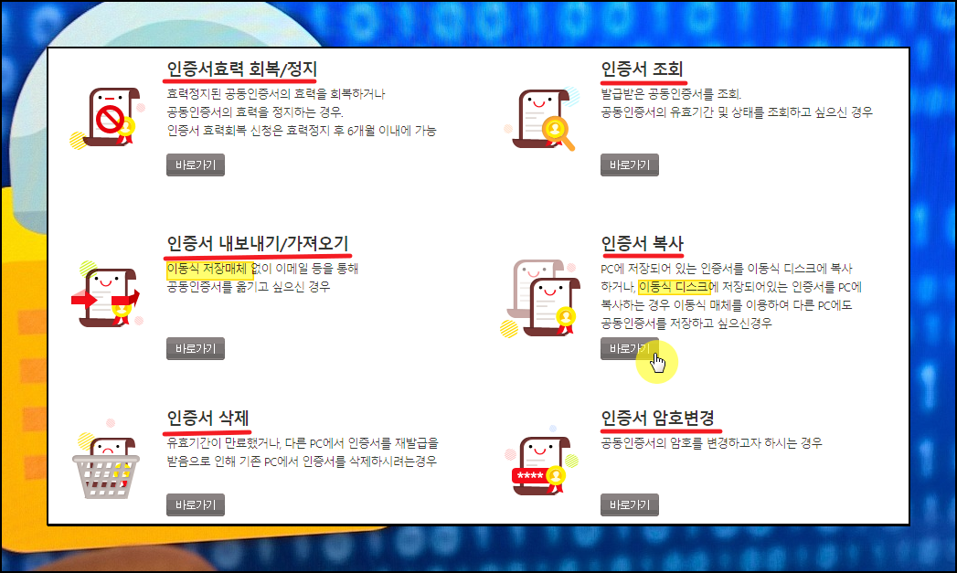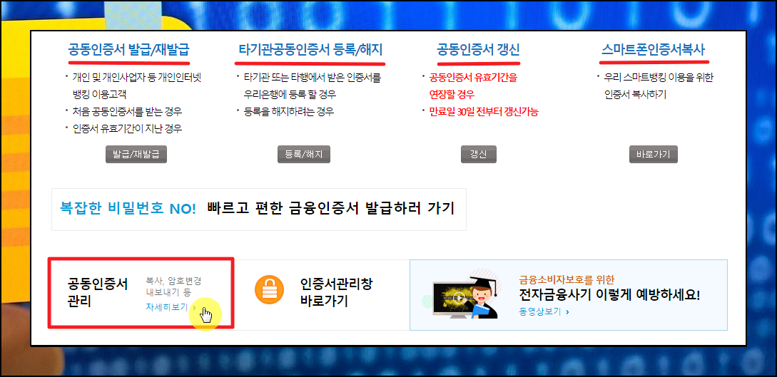 새롭게 열린 인증센터 페이지에서는 여러 가지 공인인증서 관련 서비스가 나타납니다. 여기에서는 공인인증서 발급은 물론이고, 등록이나 해지, 갱신 등 다양한 방법을 진행할 수 있는데요. 관련 파일을 usb로 옮기고 싶다면 여기에서 [관리] 메뉴를 선택해 주세요.