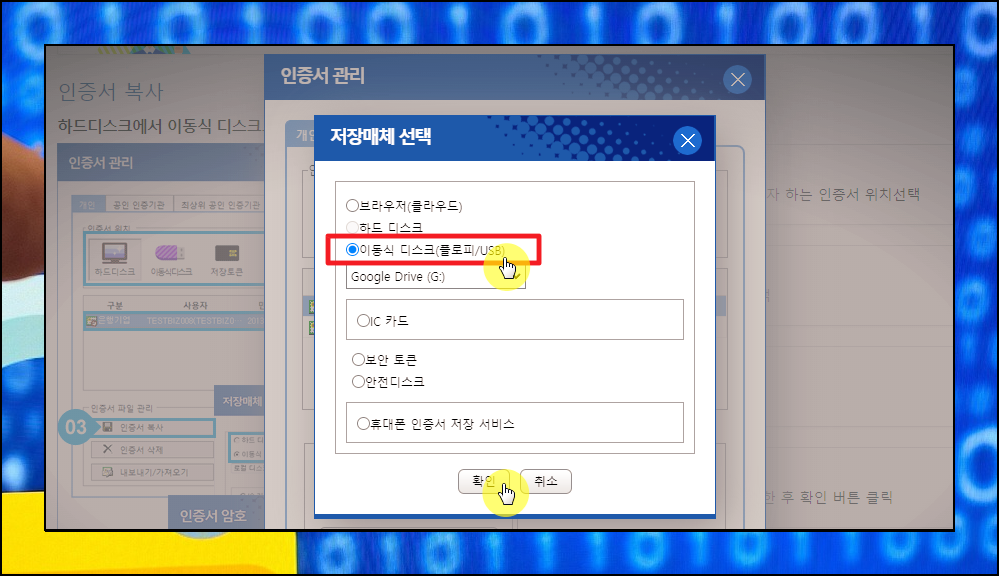 저장매체 선택 창이 열렸는데요. 여기에서 [이동식 디스크]를 선택합니다. usb가 여기에 해당합니다. 그 다음 확인 버튼 누르면 복사가 완료됩니다. 중간에 암호를 입력하는 과정이 있으니 참고하시길 바랍니다.