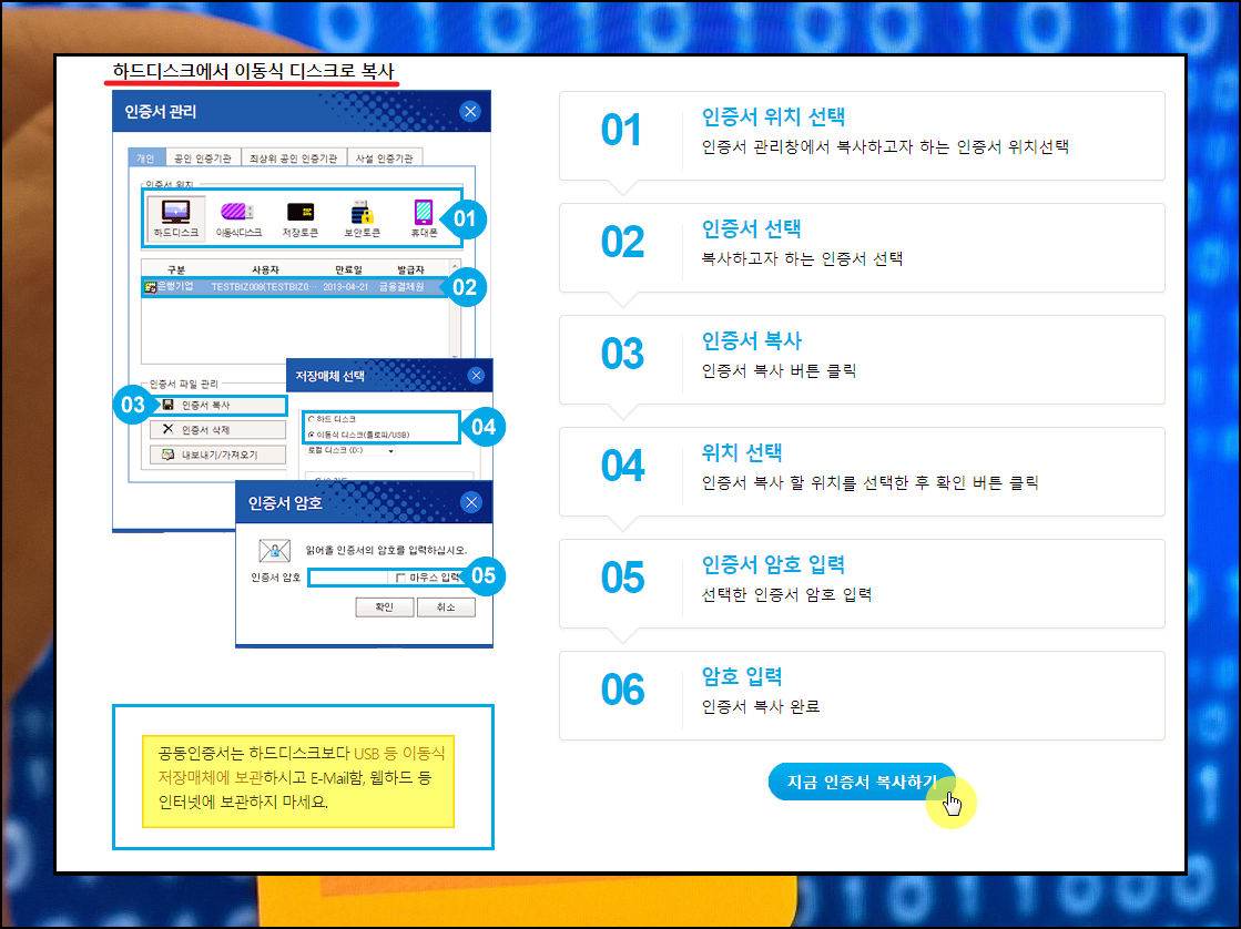 복사 페이지가 열렸습니다. 안내에 따라 순서대로 공인인증서 usb로 옮기는 방법을 따라하면 되는데요. 안내를 볼 필요도 없이 그냥 [지금 복사하기] 버튼을 눌러보세요. 굉장히 쉽습니다. 참고로 안전한 사용을 위해서는 하드디스크보다는 usb로 복사해서 보관하는 것이 안전하다고 합니다. 이메일이나 웹하드 등 인터넷 저장 매체로 옮기는 것은 추천하지 않는다고 하네요.