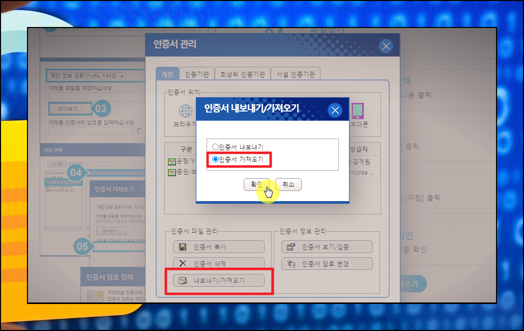 반대로 공인인증서를 usb에서 컴퓨터로 옮기는 방법도 알려드리겠습니다. [관리] 창에서 [내보내기/가져오기] 버튼을 클릭합니다. 그 다음 [가져오기]를 선택하고, 이전 단계에서 했던 것처럼 저장할 매체를 하드디스크로 선택한 후, 암호를 입력하면 됩니다.