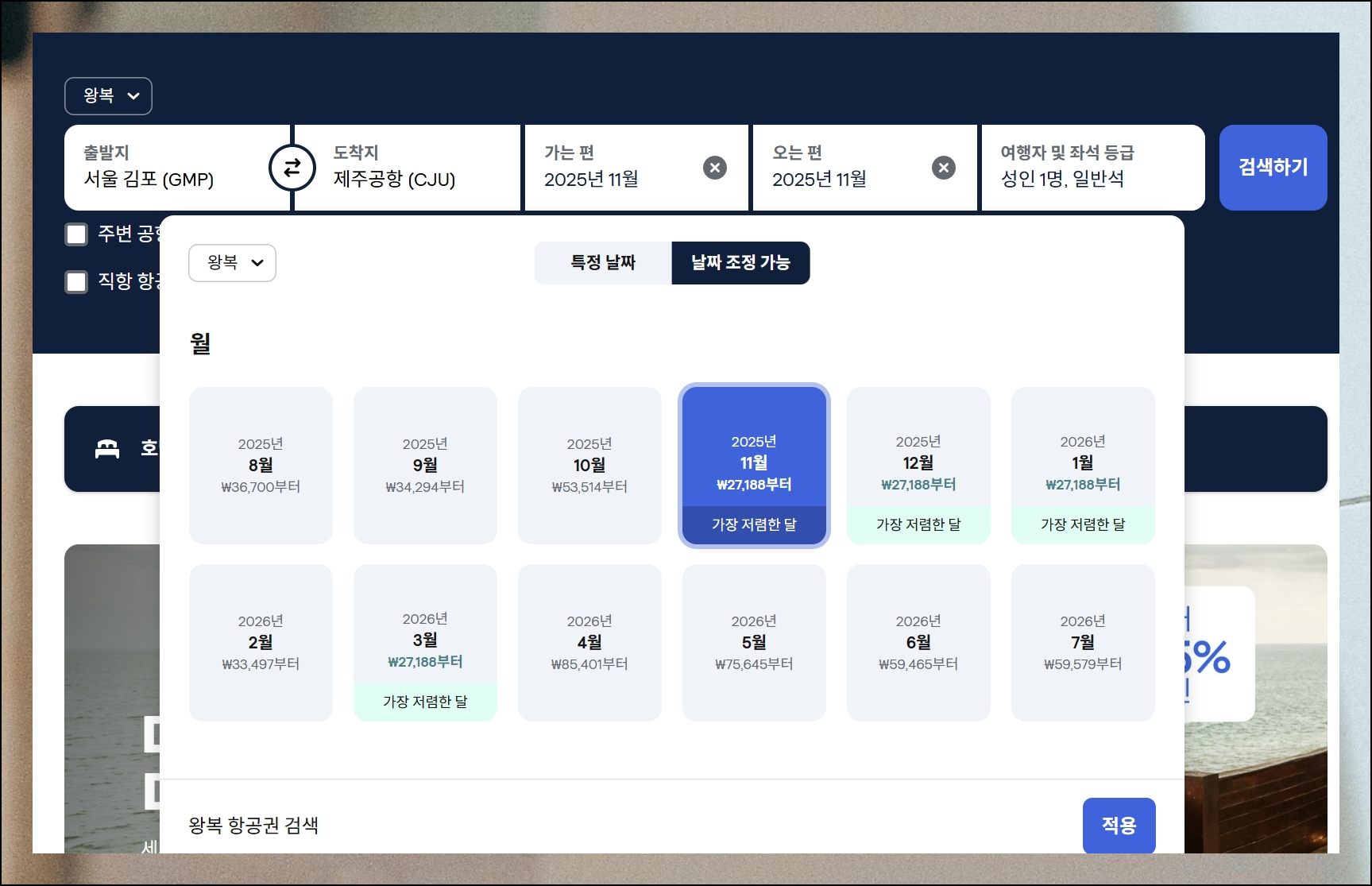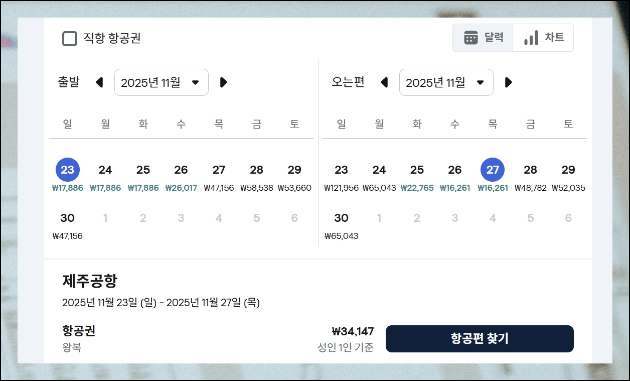 검색 버튼을 누르고 나면 달력 모양으로 된 요금표가 뜹니다. 각 날짜별로 가장 경제적인 항공권 가격을 한눈에 볼 수 있는 유용한 기능이에요. 저 같은 경우는 23일하고 27일을 골랐는데 제주도 최저가 항공권의 가격이 34,147원 정도로 나오더라고요.