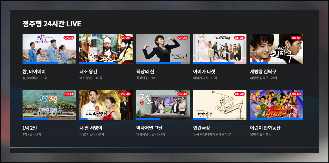 특별한 라이브 채널에서는 옛날 인기 프로그램들을 계속해서 방송해주고 있어요. 쌈 마이웨이나 태조 왕건, 직장의 신, 아이가 다섯, 제빵왕 김탁구 등 지상파 2TV에서 많은 인기를 끌었던 명작 드라마들을 언제든지 감상할 수 있거든요. 당시에 바빠서 못 봤던 작품이나 다시 한번 감상하고 싶은 프로그램이 있다면 좋은 기회가 될 거예요.