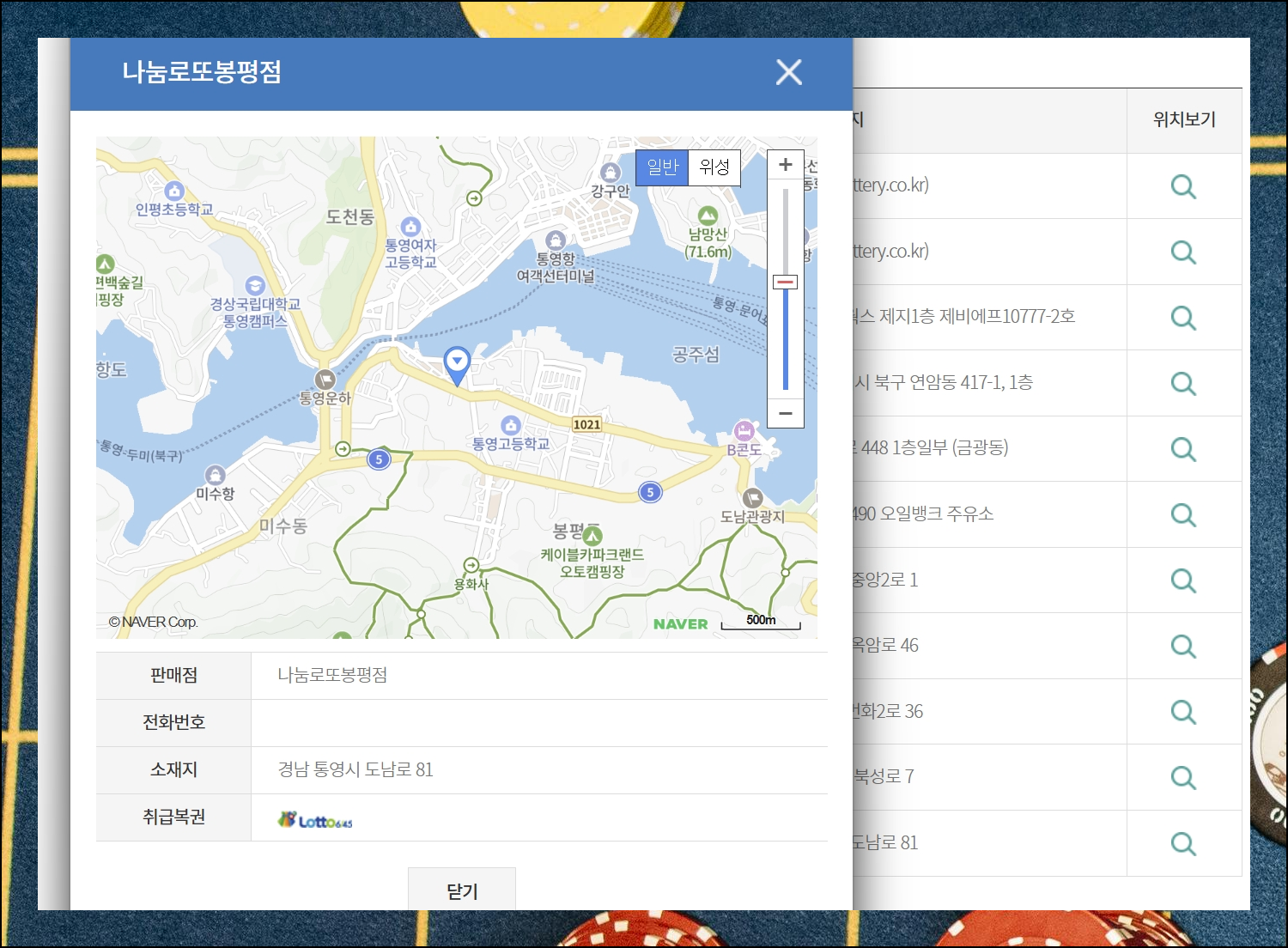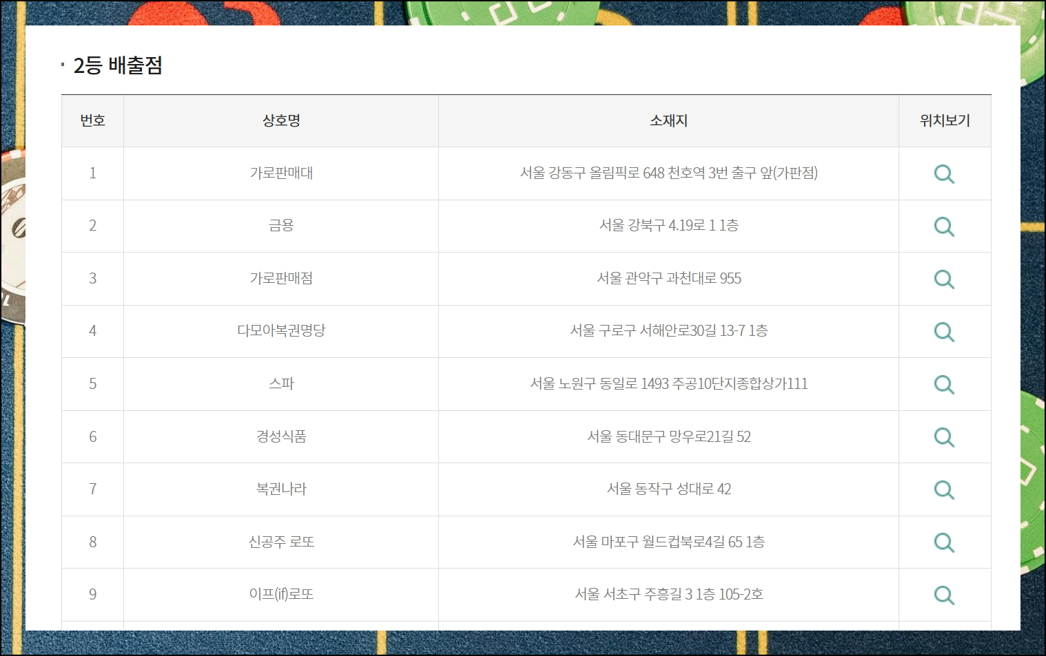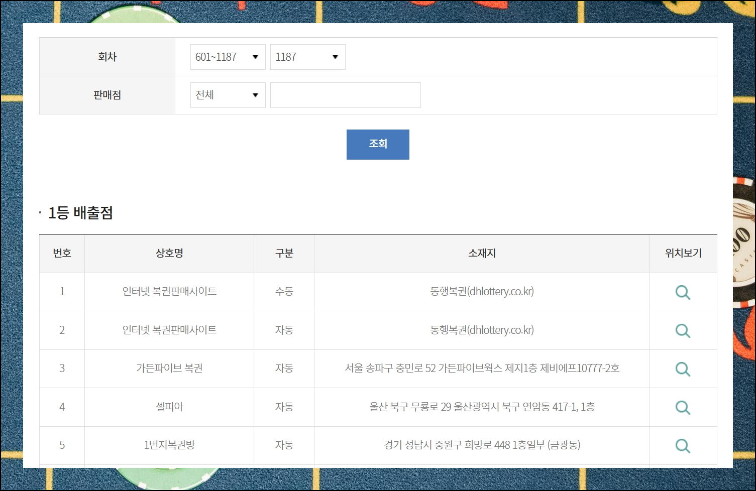 1등과 2등이 나온 기록을 가진 특별한 판매점들의 현황을 쉽게 확인할 수 있어요. 상호명과 구체적인 위치는 물론이고, 자동 구매였는지 수동 구매였는지까지 상세한 내용이 기록되어 있습니다. 여러분의 대박을 위해서 주변에 있는 행운 가득한 판매점을 직접 찾아가보시는 것도 좋아요.