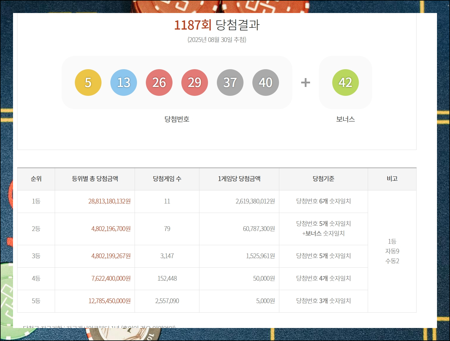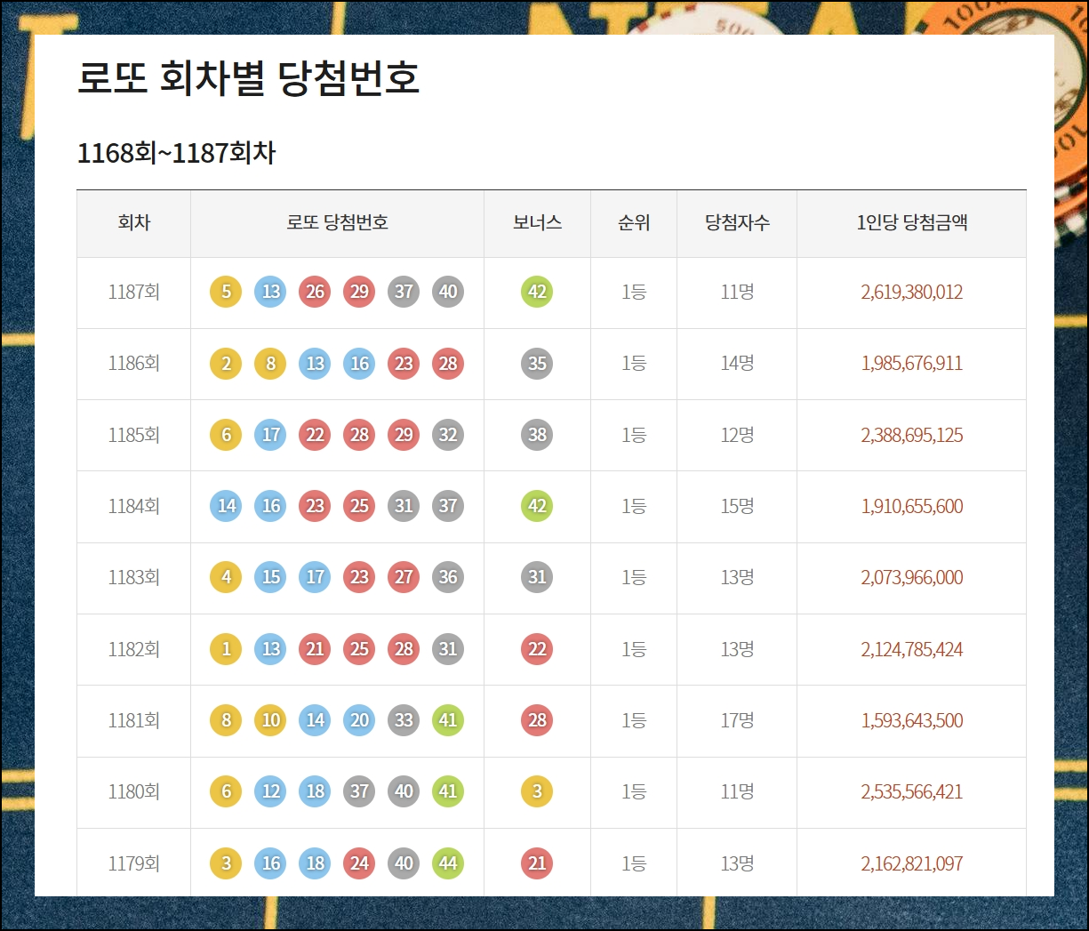 동행복권 공식 웹사이트를 통해 로또당첨번호 전체 확인은 물론이고, 엑셀로 된 파일을 직접 받아보실 수 있어요. 로또당첨번호 전체모음 자료는 꾸준히 갱신되고 있으니 새로운 소식을 놓치지 마세요. 현재를 기준으로 가장 최근에 진행된 1187회 추첨 결과까지 간편하게 얻을 수 있습니다.