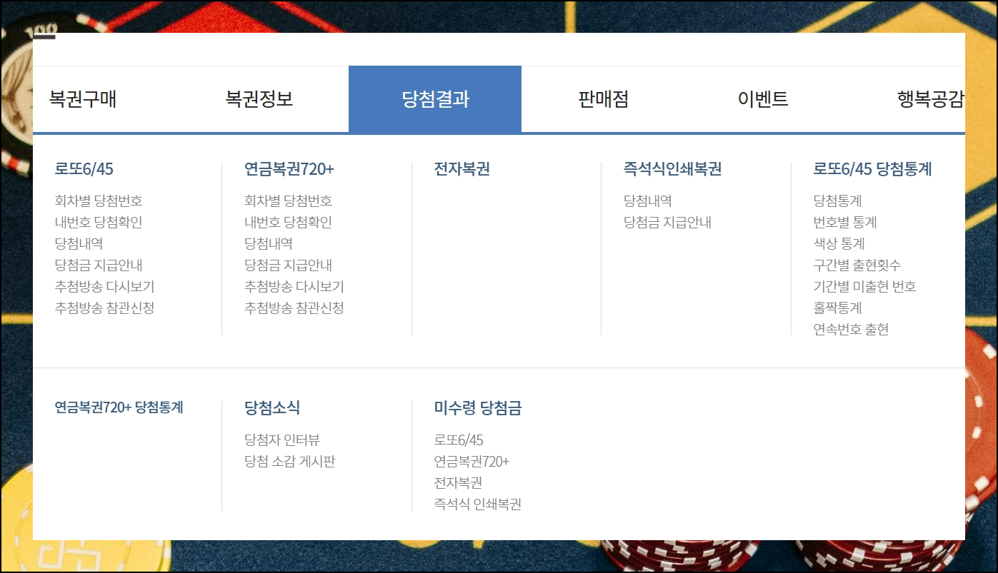 로또당첨번호를 알아보는 과정은 누구나 쉽게 할 수 있어요. 홈페이지 메인의 당첨 결과 탭을 선택한 후 6/45 카테고리로 진입하면 전체모음 데이터와 만날 수 있습니다. 엑셀 포맷으로 다운로드 받을 수도 있어서 정말 유용하죠.