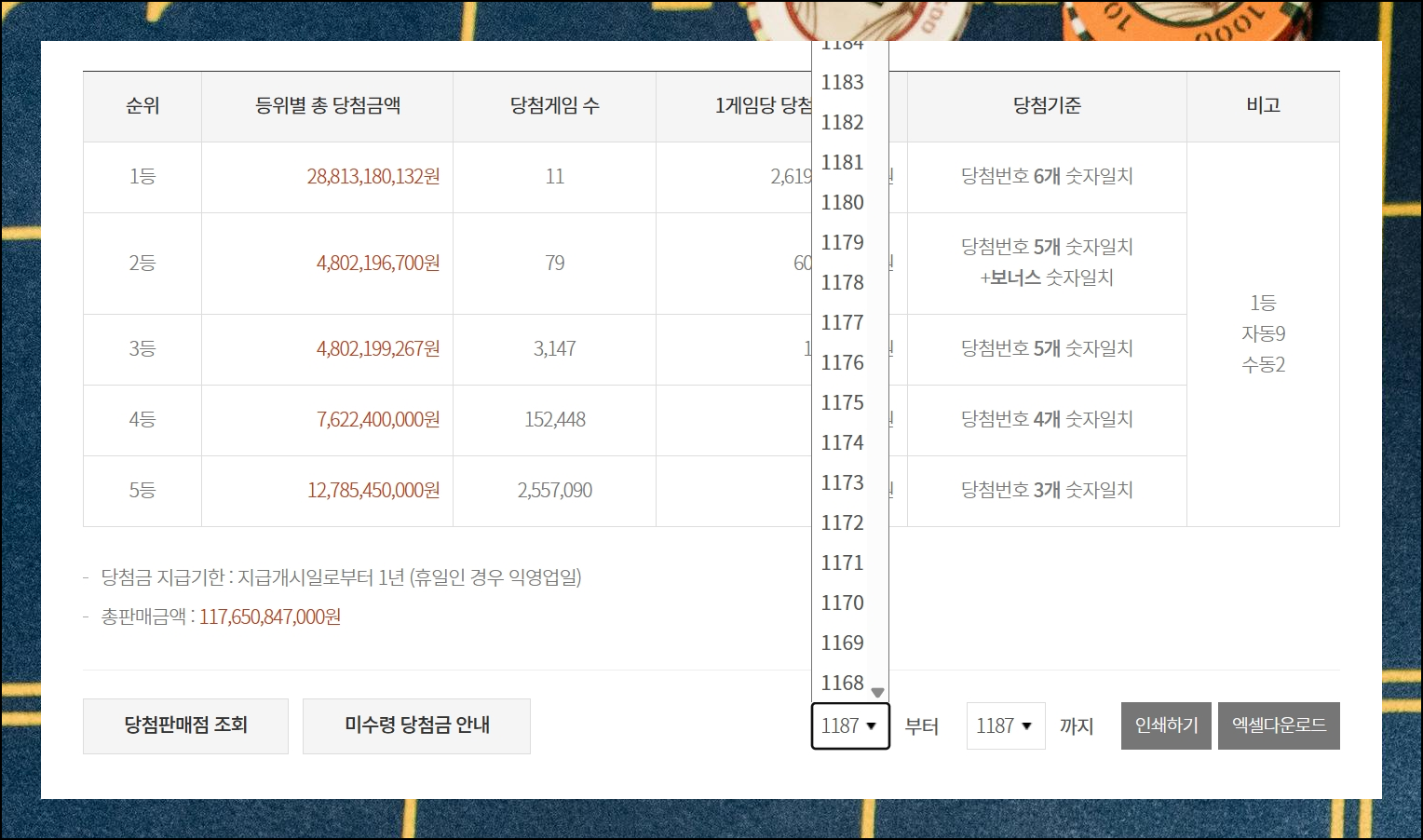 동행복권 공식 웹사이트를 통해 로또당첨번호 전체 확인은 물론이고, 엑셀로 된 파일을 직접 받아보실 수 있어요. 로또당첨번호 전체모음 자료는 꾸준히 갱신되고 있으니 새로운 소식을 놓치지 마세요. 현재를 기준으로 가장 최근에 진행된 1187회 추첨 결과까지 간편하게 얻을 수 있습니다.