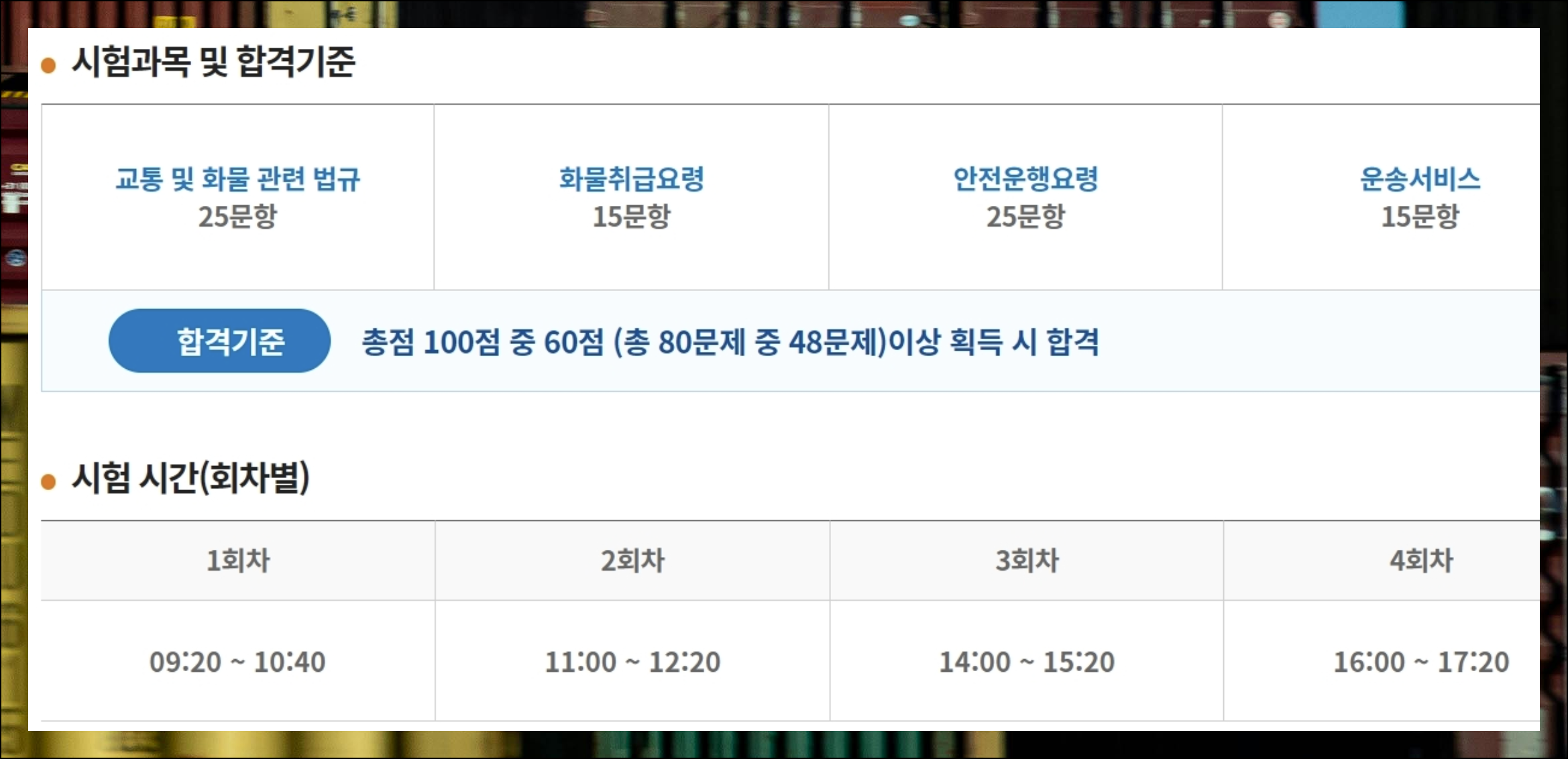 시험을 성공적으로 통과하려면 먼저 합격 기준을 명확히 알아두셔야 해요. 해당 시험은 4개 과목으로 나뉘어 출제가 되는데요. 총 80문항 가운데 48문항 이상을 정답으로 맞혀야 합격할 수 있습니다. 주어진 시험 시간은 80분인데요. 이를 고려하면 하나의 문항에 대하여 대략 1분 정도의 시간 배분이 필요합니다. 평소 기출문제를 풀 때도 이 시간을 지켜가며 연습하는 것이 중요해요.