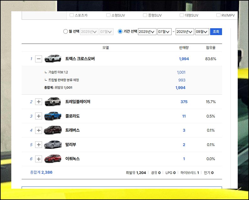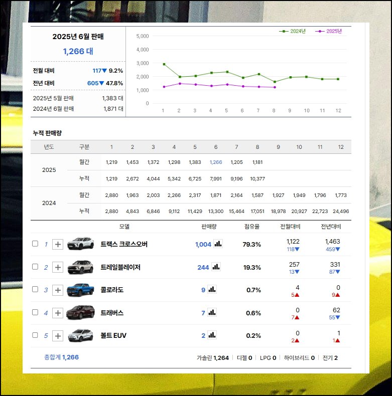 자동차 시장에서 가장 주목받는 쉐보레 차종류에 따른 실제 판매 성과를 살펴보겠습니다. 2025년 6월 기준으로 트랙스 크로스오버가 무려 1,004대를 판매하며 독보적인 1위 자리를 차지했어요. 그 뒤를 이어 트레일블레이저, 콜로라도, 트래버스 순으로 소비자들의 선택을 받았습니다.
