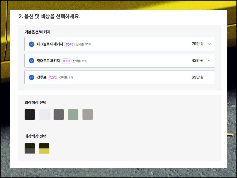 세부 모델 결정이 끝나면 이제 본격적인 옵션 선택 단계가 시작됩니다. 각각의 옵션을 추가하거나 제외할 때마다 차량의 최종 가격이 실시간으로 변동되니까 신중하게 선택해야 해요. 옵션 가격 옆에 있는 화살표 모양 아이콘을 클릭하면 상세한 설명을 볼 수 있습니다.