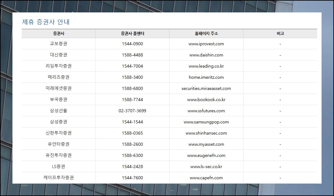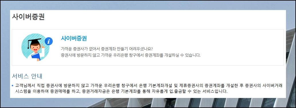 거의 모든 증권회사 주식계좌를 만들 수 있는데요. 하지만 본인이 원하는 특정 증권사가 우리은행과 제휴 관계에 있는지 미리 체크해보시는 게 좋아요.