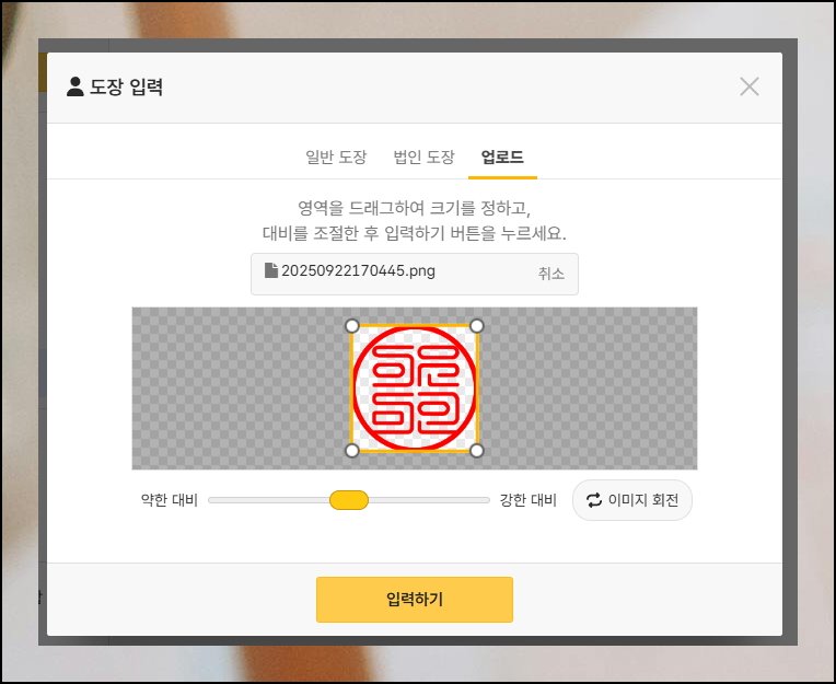 소유하고 있는 실제 인감을 디지털 파일로 변환하려면 업로드 기능을 활용하세요. 실물 인장을 사진으로 촬영해서 업로드하면 디지털 버전으로 자동 변환됩니다.