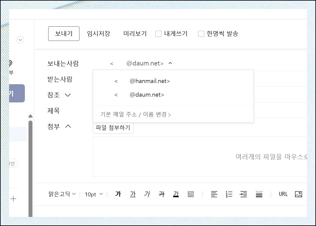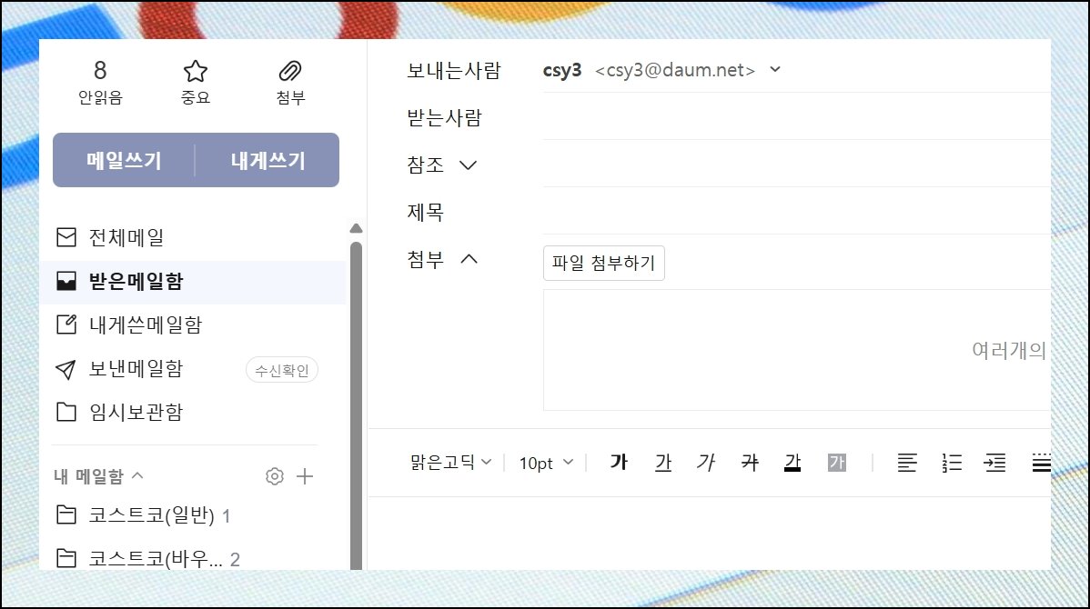 본인에게 이메일을 발송하는 "내게쓰기" 화면에서 상단 체크박스를 활성화해보세요. 그러면 발신자 정보가 노출되는데요. 바로 이것이 카카오 이메일 계정 주소이에요. 이 방식이 작동하지 않으면 좌측 [받은 편지함]을 선택해서 발신자 칸에서 주소를 확인하세요.
