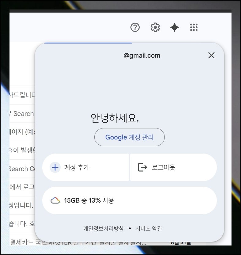 GMAIL 페이지 접속 후 스크린 우측 상단 개인 프로필 이미지를 클릭해보세요. 프로필 정보 팝업창이 나타나면 구글 계정 관리 항목에서 본인의 이메일 주소를 바로 확인할 수 있습니다.