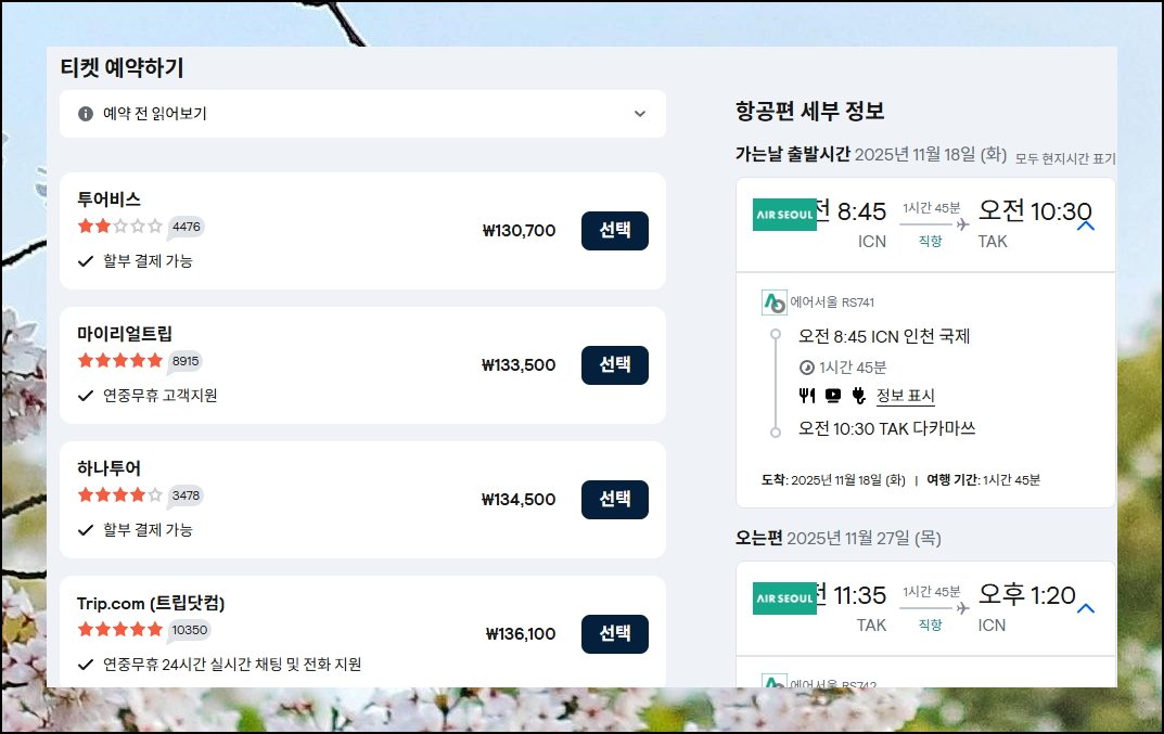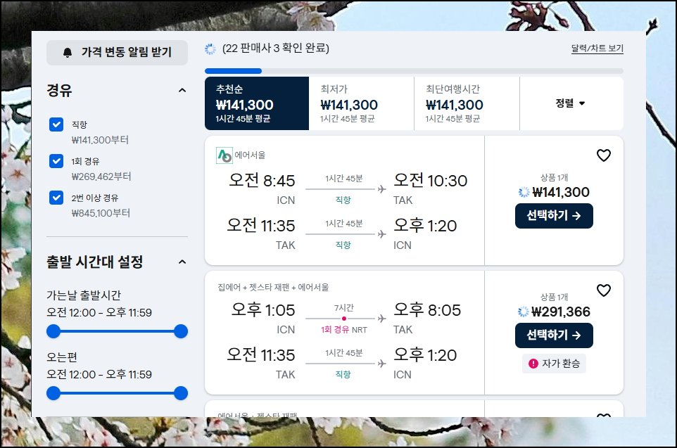 원하는 항공편을 클릭하면 예약 가능한 업체들이 나타나요. 일본행 비행기표는 수시로 바뀌기 때문에 알림 기능을 설정해두시는 걸 권장합니다. 현재 확인한 금액이 합리적이라고 생각되면 바로 예약 절차를 시작하셔도 좋아요.