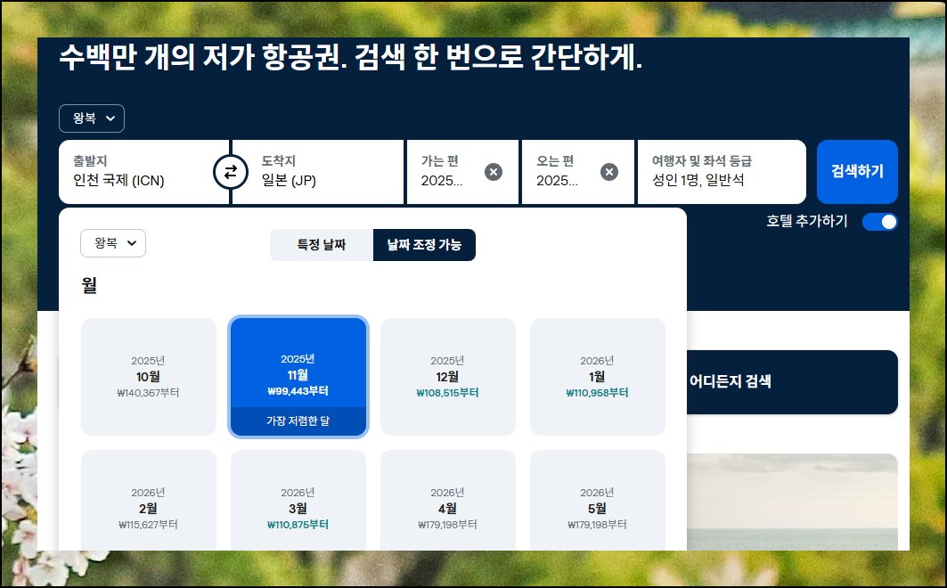 항공권을 찾기 위해서는 먼저 기본적인 여행 정보를 입력해야 해요. 목적지는 일본으로 설정하고 출발 공항을 선택하면 됩니다. 여기서 놓치면 안 되는 중요한 설정 두 가지가 있어요. 첫째는 직항편만 보기 옵션을 반드시 활성화하는 거예요. 둘째로는 "날짜 조정 가능" 기능을 켜서 월 단위로 검색해보세요. 가장 저렴한 달을 선택하면 가격이 더 싼 비행기표를 발견할 확률이 높아집니다.