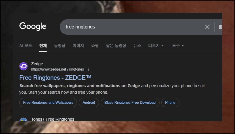 최신곡이나 인기곡을 벨소리로 쓰고 싶은 분들 많을 거예요. 하지만 저작권 문제로 유료 결제가 필요합니다. 솔직히 벨소리는 금방 질리기 때문에 비용 들여서 구입하는 건 비효율적이죠. 그래서 무료로 이용 가능한 곳을 소개하려고 해요. ZEDGE라는 사이트인데요. 검색창에 FREE RINGTONES를 입력하면 쉽게 찾을 수 있어요.