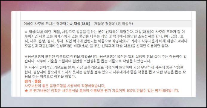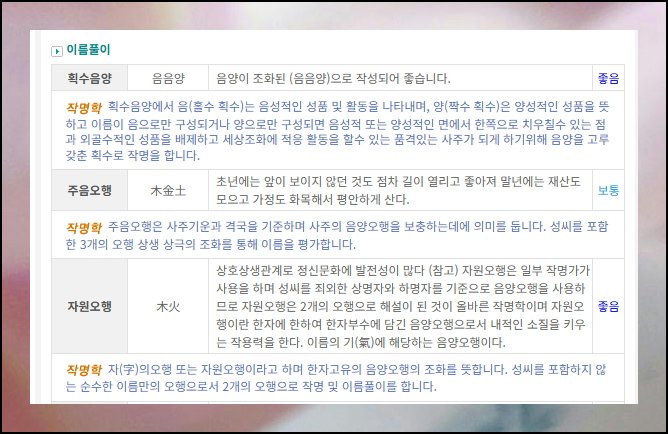 부모 성함과의 조화 정도나 피해야 할 글자인지도 확인 가능해요. 주역 해석도 제공되는데, 어렵다 싶으면 간단한 요약 결과만 보면 됩니다.