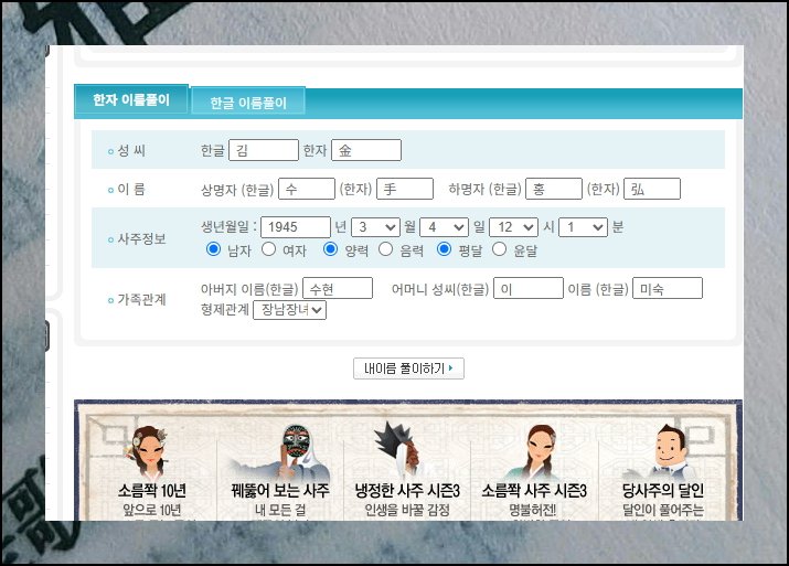 성과 이름을 한자로 적어넣으세요. 태어난 날짜와 시간 같은 사주 데이터도 함께 기입해야 합니다. 정확한 정보를 넣을수록 신뢰도 높은 결과를 받을 수 있습니다.