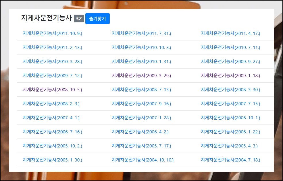 기출 문제가 시험 회차별로 깔끔하게 분류되어 있어요. 각 시험의 실시 날짜가 정확히 표기되어 있어서 최근 출제 흐름을 쉽게 알 수 있습니다. 지게차운전기능사 시험이 어떻게 변화하고 있는지 파악할 수 있죠.
