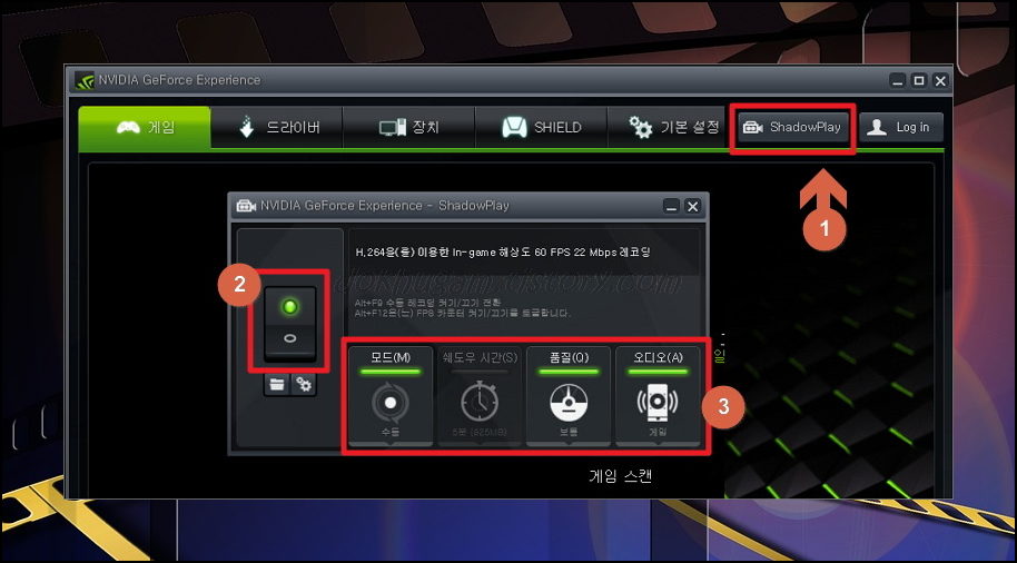 Geforce Experience 실행화면입니다. 우측 상단에 있는 "샤도우 플레이" 버튼을 누르면 설정이 나오는데요. ②번의 스위치를 키면 바로 사용할 수 있답니다. ③번은 설정인데요. 각 부분에 대한 내용은 다음과 같습니다.
