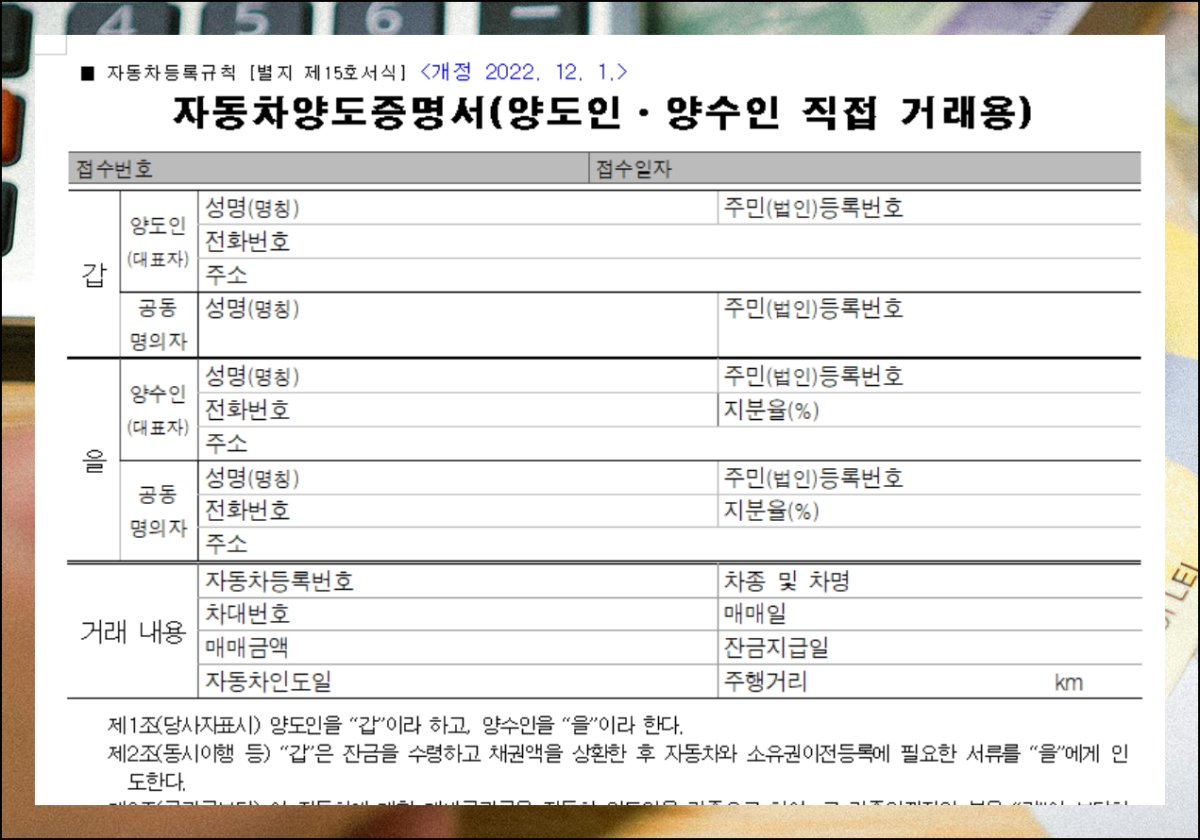 자동차 매매계약서에 드디어 새로운 변화가 생겼습니다. 오랜만에 차량 민원포털에 접속했더니 예전과는 확연히 다른 최신 버전을 발견했어요. 무료로 내려받을 수 있는 파일을 직접 준비해두었습니다. 서명란 부분이 이전보다 훨씬 나아졌어요. 인터넷만 있으면 누구나 쉽게 이용 가능합니다.