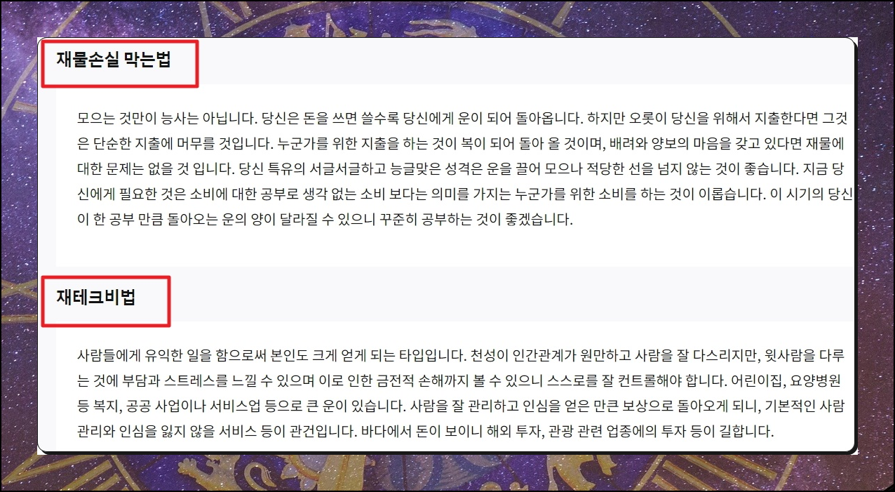 그 다음으로는 건강, 체질, 타고난 성향, 타고난 인품에 대한 내용이 나오는데요. 몰랐던 자신에 대해 깊이 있게 알아볼 수 있습니다. 마지막으로 재물 손실 막는 법과 재테크 비법도 사주풀이 사이트에서 알려주고 있으니 경제에 관심이 많은 분이라면 꼭 한 번 읽어보시길 바랍니다.