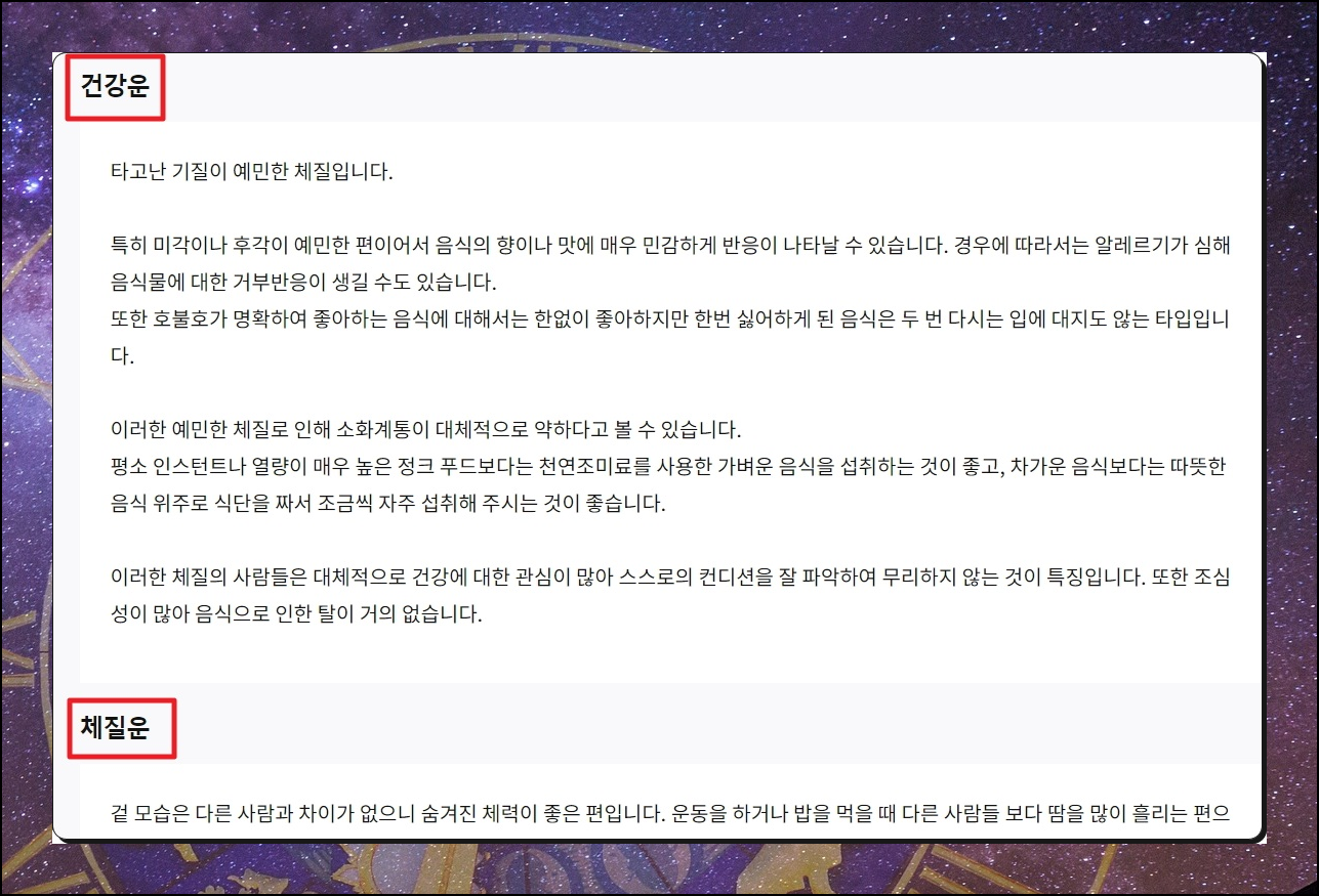 그 다음으로는 건강, 체질, 타고난 성향, 타고난 인품에 대한 내용이 나오는데요. 몰랐던 자신에 대해 깊이 있게 알아볼 수 있습니다. 마지막으로 재물 손실 막는 법과 재테크 비법도 사주풀이 사이트에서 알려주고 있으니 경제에 관심이 많은 분이라면 꼭 한 번 읽어보시길 바랍니다.