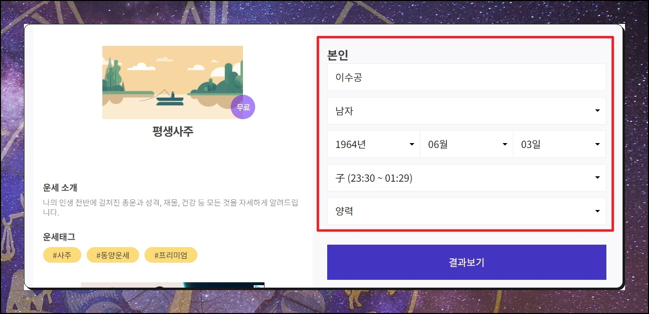 저는 이곳에서 나의 평생에 대해 알아볼 수 있는 "무료 사주풀이 서비스"를 이용해 보았습니다. 다른 운세 사이트와 동일하게 이용자에 대한 성명, 성별, 태어난 시기에 대해 묻는데요. 이러한 정보를 정확하게 입력해야 제대로 된 결과를 얻을 수 있습니다.