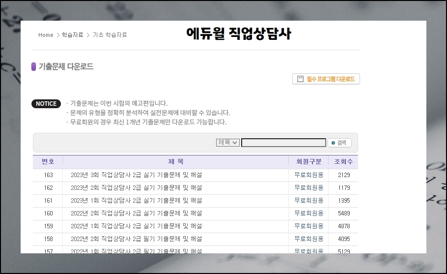 마지막으로 에듀윌 사이트에서도 무료회원을 대상으로 최신 직업상담사 2급 실기 기출문제 및 해설 자료를 제공하고 있으니 참고하시길 바래요.