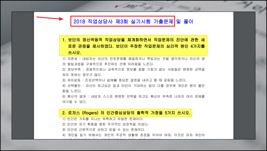 우선 직업상담사 2급 실기 기출문제가 어떻게 생겼는지 살펴보도록 할게요. 로저스의 인간중심상담의 철학적 가정 5가지와 같이 필답형으로 문제가 출제되고 있는데요. 이번에 이용할 자료를 보면 풀이를 통해 해당 문제에 관련된 내용을 학습하기에 좋아요.