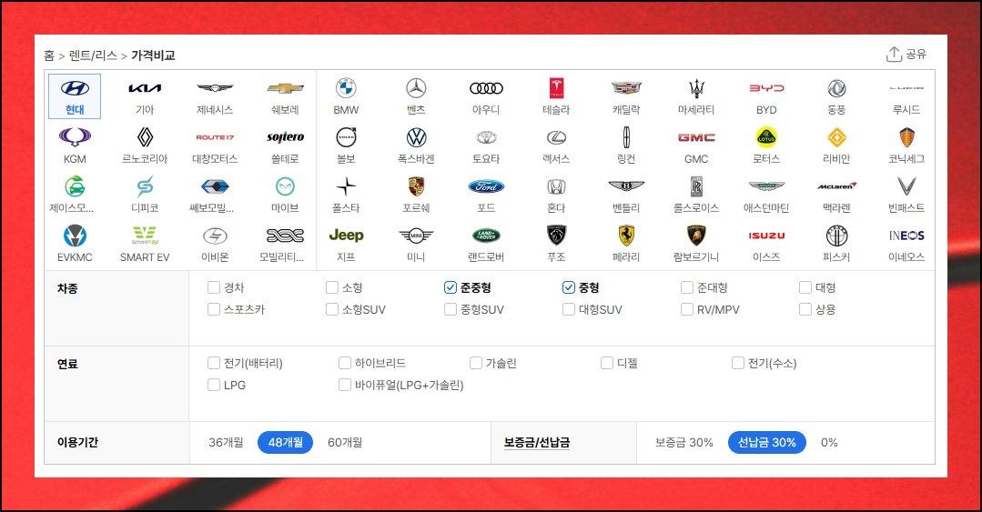 희망 브랜드와 자동차 모델을 먼저 확정하세요. 이어서 계약 기간, 초기 납부 방식을 지정해야 합니다. 이 설정값들이 매달 내야 하는 비용을 결정짓는 핵심 요인이므로 리스가격표를 보며 하나하나 신중히 따져볼 필요가 있어요.