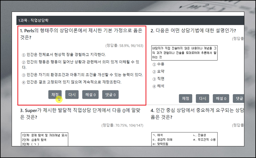 직업상담사 2급의 경우 최근에 시행된 시험 자료까지 다루고 있네요. 풀어보고 싶은 회차를 선택해 보세요.