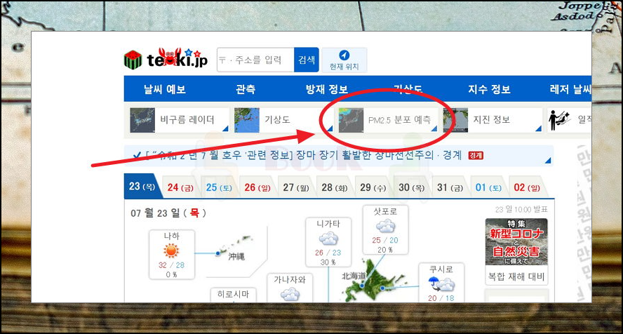 tenki 사이트에 접속했어요. 메인화면에 일본 지도가 나와서 당황하셨을 수 있어요. 사이트는 일본어로 되어 있고요. 이 때 크롬 브라우저를 사용하면 좋아요. 번역 기능을 틀면 한국어로 나오기 때문이에요. 메인화면에 있는 pm2.5 분포 예측을 클릭해 보세요.