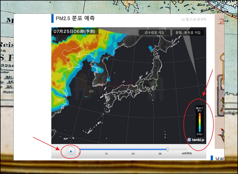 위성사진에서 아래쪽을 보면 재생 버튼이 있어요. 해당 버튼을 클릭해 보세요. 그럼 시간이 흐름에 따라 미세먼지 상황이 어떠한지 실시간으로 확인할 수 있어요. 지도에서 우측 하단을 보면 색에 따라 농도가 얼마를 뜻하는지 알 수 있어요.