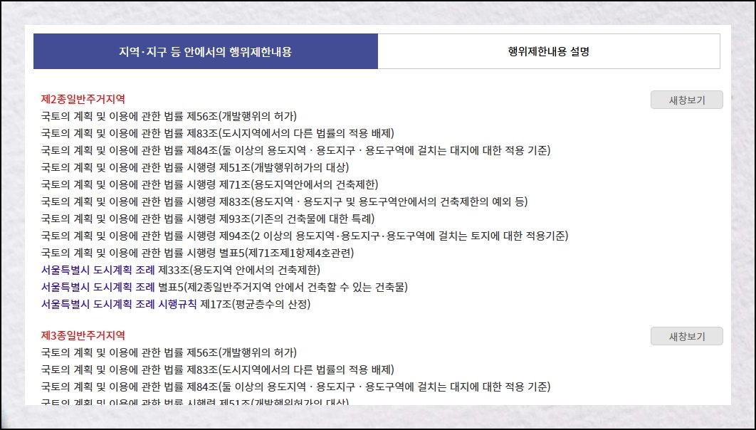 토지이용계획확인원 하단으로 내려가면 해당 구역에서 허용되거나 금지되는 활동 목록을 살펴볼 수 있어요. 개별 법 조문을 선택하면 구체적인 규정이 펼쳐집니다. 법령정보센터로 곧바로 이동하는 버튼도 마련되어 있어 관련 법률을 더 깊이 탐색하는 것도 가능해요. 이처럼 온라인만으로 무료열람을 손쉽게 진행할 수 있으니, 토지 정보가 필요할 때 적극 이용해 보시길 권합니다.