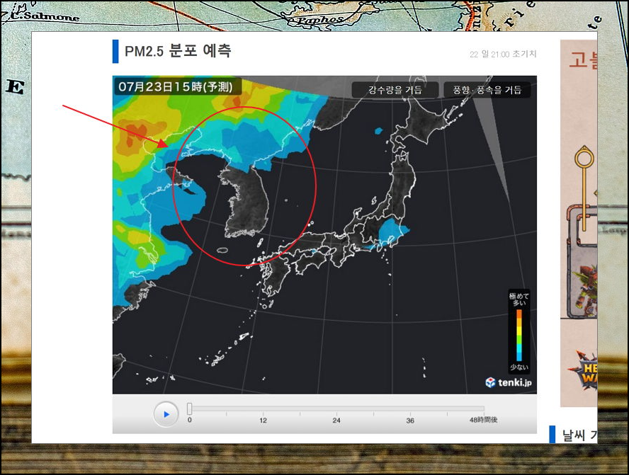 새롭게 열린 페이지에서 미세먼지 위성사진 실시간 지도를 확인할 수 있는데요. 일본 사이트임에도 불구하고, 우리나라까지 나와 있어요. 그렇기 때문에 국내 대기 상황을 확인하기에 정말 좋아요.