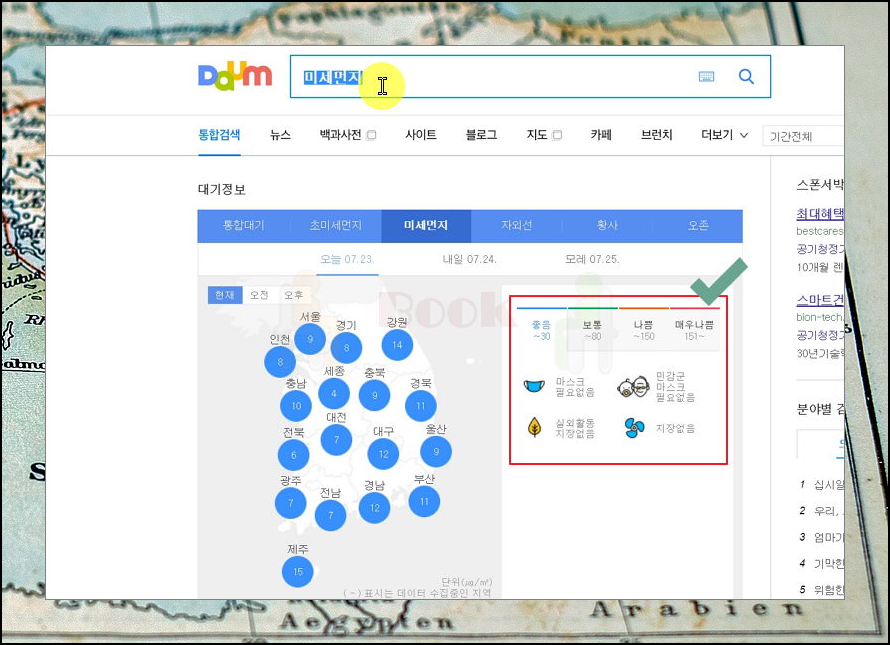 단순히 국내 미세먼지 농도를 확인하고 싶을 때에는 다음의 대기정보 서비스를 이용해 보세요. 거의 실시간으로 제공되는 정보에요. 농도는 크게 4가지로 나뉘는데요. 좋음, 보통, 나쁨, 매우 나쁨이에요. 각 수치에 따른 생활수칙도 확인할 수 있어요. 위성사진은 아니지만, 지도로 각 지역의 대기질을 확인할 수 있어요.