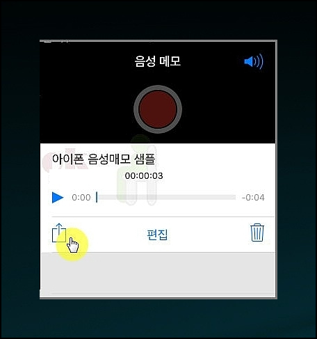 녹음이 완료되었으면 정지 버튼을 눌러 음성메모 저장을 해주세요. 그럼 저장한 이름이 하단 리스트에 뜨는데요. 해당 메모를 클릭한 후 옮기기 버튼(또는 공유 버튼)을 클릭해 주세요.
