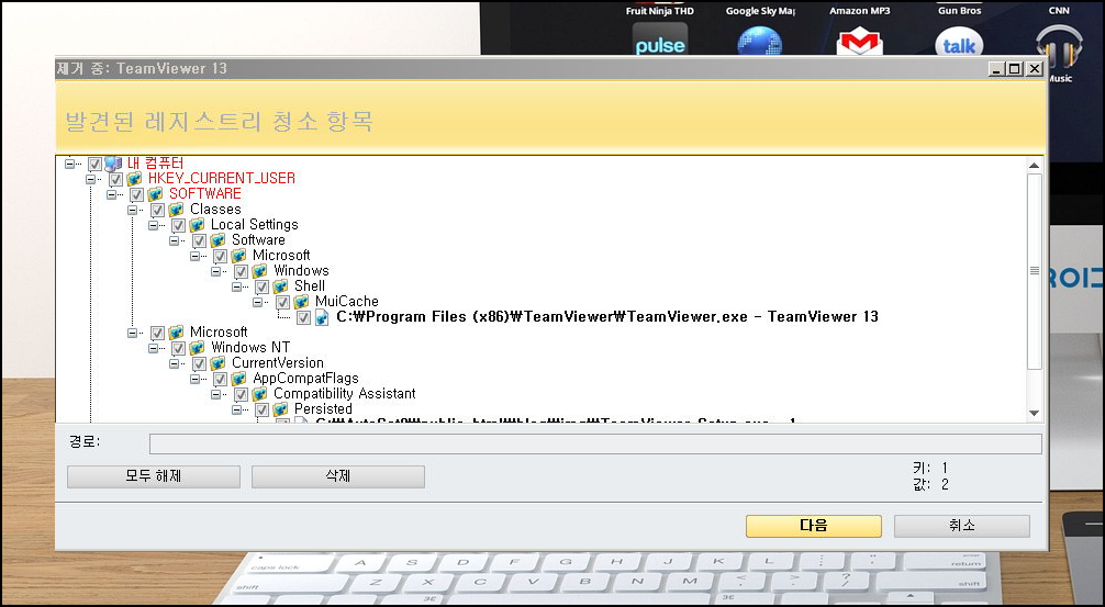 레지스트리 청소 항목이 나타 나는데요. 문제가 없다고 생각되시면 삭제 버튼을 눌러 평가판에 대한 레지스트리를 제거해주세요.