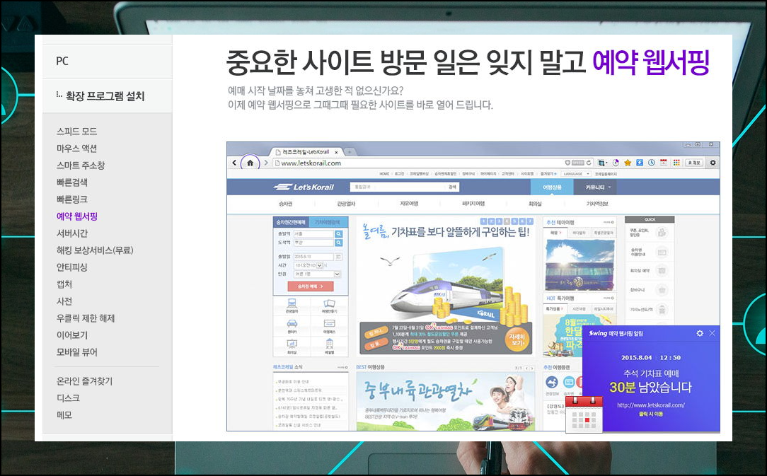 스윙 브라우저는 기능이 참 많습니다. 그 중에서 유용하게 사용할 수 있는 기능을 뽑아 보았는데요. 첫 번째는 예약 웹서핑입니다. 추석 기차표 예매를 하거나 대학교 수강신청을 할 때 유용하게 사용할 수 있는 기능인데요. 몇 분 남았는지 알려주고, 때가 되면 사이트를 열어주기 때문에 굉장히 편리해요.