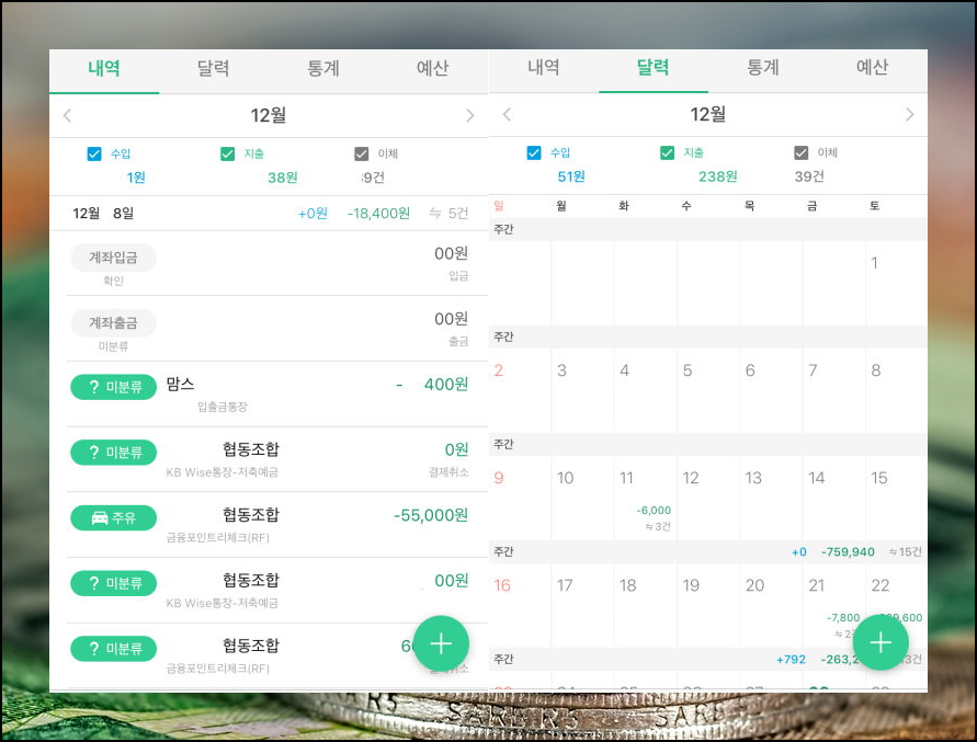 4. 실시간 내역으로 자금을 관리해봐요. 제가 주로 이용하는 것은 가계부 기능입니다. 내역 탭을 클릭하면 신용카드에 대한 사용내역서를 실시간으로 확인할 수 있어요. 통장 입출급 내역도 바로바로 뜨기 때문에 자금 관리가 굉장히 수월합니다. My금융 카테고리에서는 통장과 신용카드에 따른 사용액을 알아보기 쉽고요. 가계부 카테고리에서는 구체적인 사용내역서를 알아보기 쉽습니다. 달력 탭을 클릭하면 하루에 얼마나 지출했는지도 한눈에 확인할 수 있습니다.